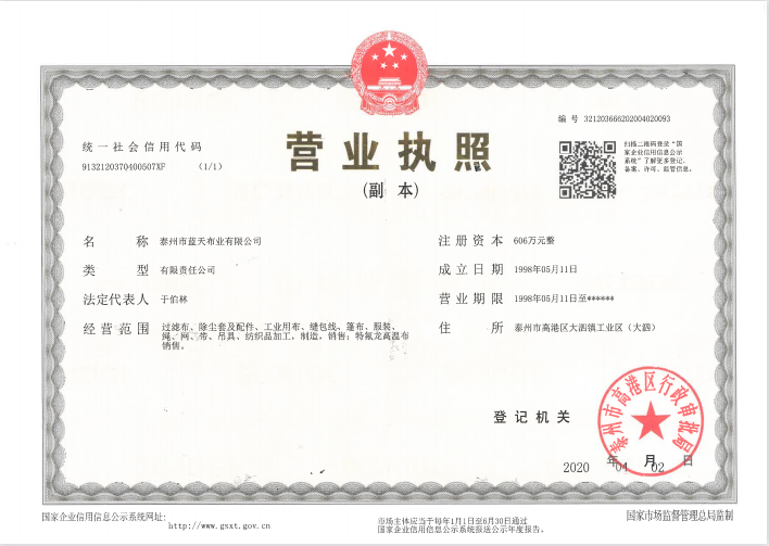 公司專業(yè)從事紡織業(yè)生產(chǎn)已三十多年,已成為一家從紡絲、織造、后整理到后加工一條龍的企業(yè)。公司位于江蘇省泰州市高港區(qū)大泗工業(yè)園區(qū),交通方便,占地100余畝,擁有現(xiàn)代化標(biāo)準(zhǔn)廠房,現(xiàn)有員工120人,年產(chǎn)過濾布300萬(wàn)米、除塵布袋600萬(wàn)米、縫包線、長(zhǎng)絲線4...